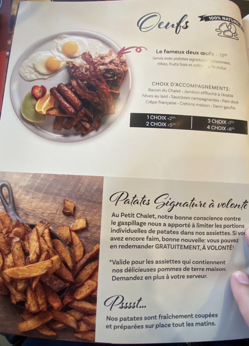 Une crêpe, demi gaufre, pain doré, bacon du chalet, saucisses campagnardes, jambon effiloché à l'érable, fèves au lard et pommes de terre maison. / One crepe, half waffle, french toast, chalet bacon, country sausages, maple flaked ham, baked beans and homemade potatoes.